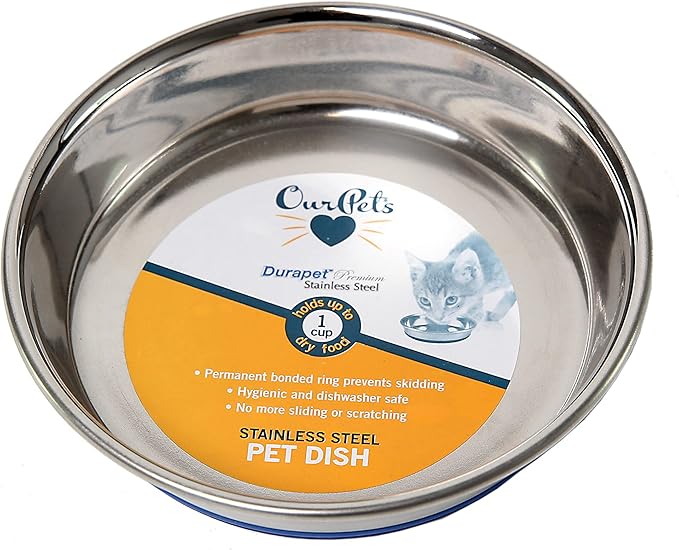 - PATENTED SKID-PROOF BOTTOM: The OurPets DuraPet Stainless Steel Cat Bowl is a top-of-the-line design at an affordable price. To prevent skidding, we added a permanent bonded ring to the bottom. This patented, skid-proof design prevents sliding and tipping during feeding time.
