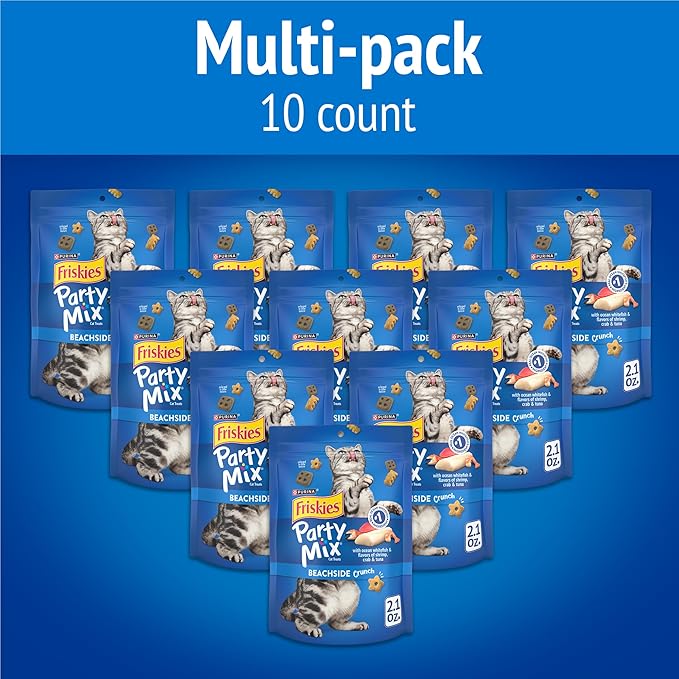 - Purina Friskies Party Mix Beachside Crunch adult treats for cats are crafted in Purina-owned U.S. facilities and backed by Purina's more than 90 years of innovation