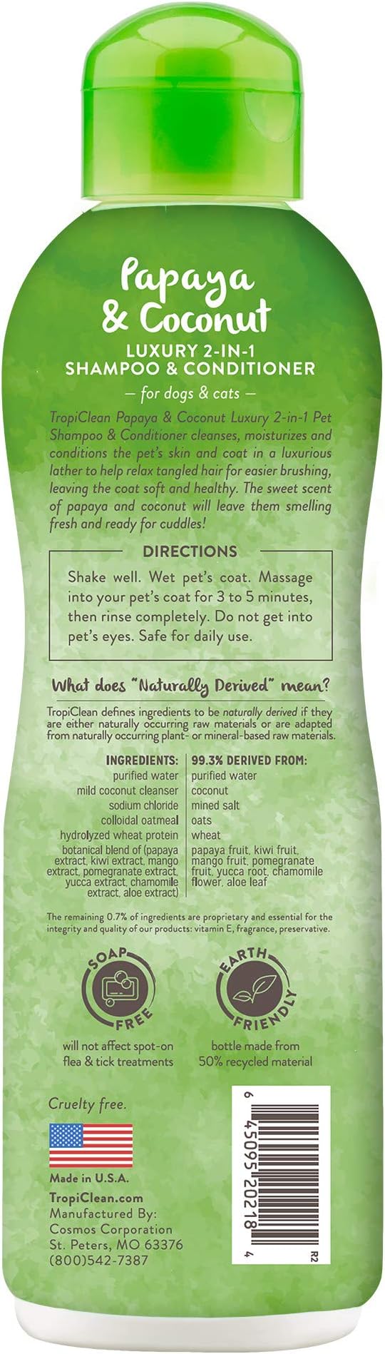 TropiClean 2-in-1 Dog Shampoo and Conditioner, Moisturizing Dog Detangler, Puppy Safe, Made in the USA, Papaya Scent, Cat & Kitten Safe, 20oz.