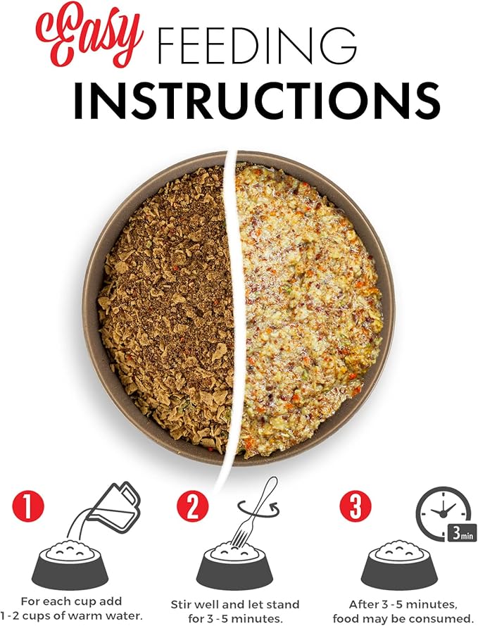 - JUST ADD WATER - For each cup of dog food add 1-2 cups of warm water. Stir well and let stand for 3-5 minutes