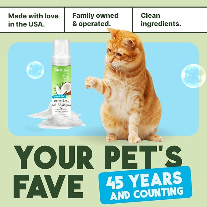 TropiClean No Rinse Waterless Cat Shampoo | Dandruff Treatment | Moisturizing Dry Shampoo for Dry Skin | USA Made | Aqua de Coco Scent | 7.4oz.