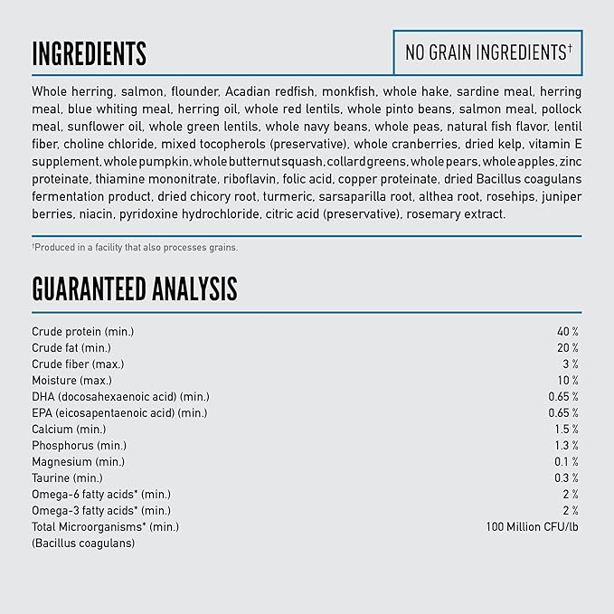 - First six ingredients are raw** whole mackerel, whole herring, flounder, Acadian redfish, monkfish and whole hake