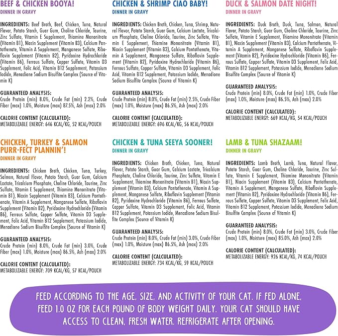 - Potluck O' Pouches Variety Pack (2.8oz Pouches, Pack of 12) OMG, Six different flavors in one variety pack! Featuring premium proteins like tuna, chicken, salmon, beef, lamb and duck in a tasty gravy.