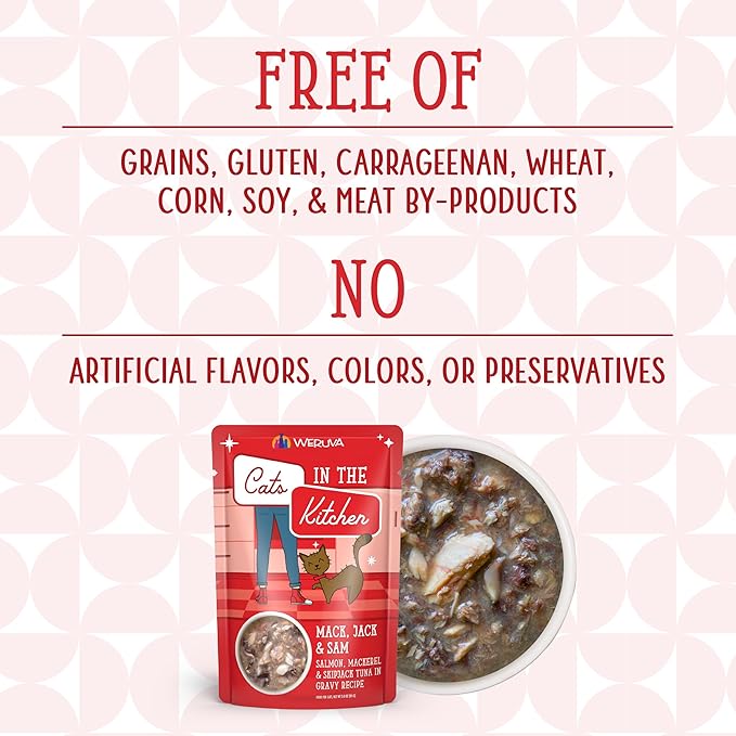 Weruva Cats in The Kitchen Mack, Jack & Sam with Mackerel, Skipjack & Salmon in Gravy Cat Food, 3oz Pouch (Pack of 12)