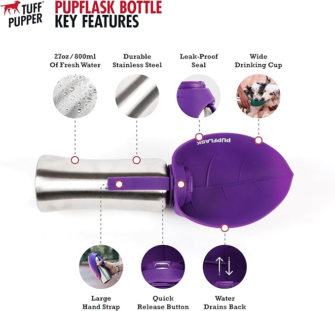- HAPPY, HYDRATED PETS make the best traveling companions, and the PupFlask goes wherever you and your furry friend venture. Reversible leaf-shaped bowl lays flat over bottle when not in use.