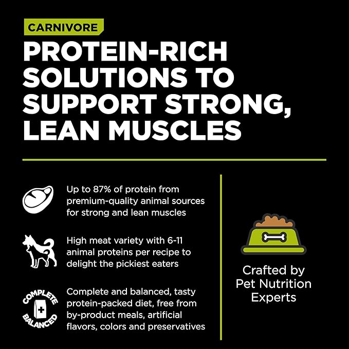 - PROTEIN-RICH FOOD TO SUPPORT STRONG, LEAN MUSCLES: The first six ingredients and 87% of the protein in our grain free CARNIVORE Chicken, Turkey + Duck puppy food comes from real premium-quality meat + fish.