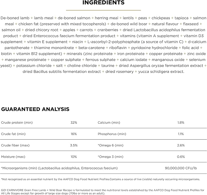 Go! Solutions Carnivore, Grain-Free, Protein Rich Dry Dog Food, Lamb and Wild Boar Recipe, 3.5 lb Bag