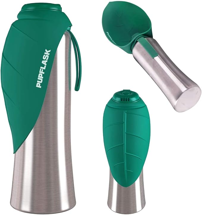 - HAPPY, HYDRATED PETS make the best traveling companions, and the PupFlask goes wherever you and your furry friend venture. Reversible leaf-shaped bowl lays flat over bottle when not in use.