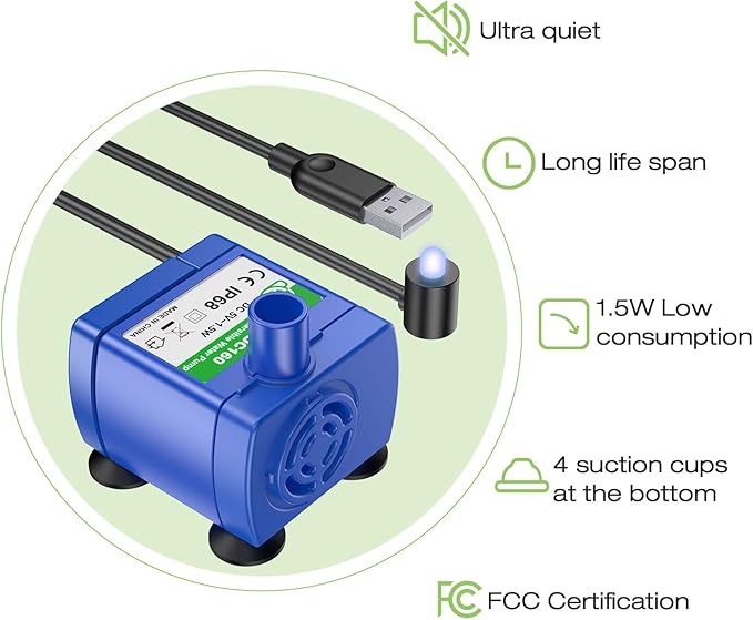- Circulating filtration system: A replaceable charcoal filter removes dirt and food particles, and a pre-filter sponge designed to catch hair and debris. It provides fresh clean water to your lovely pets.