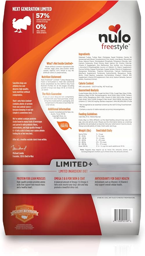 - Limited Ingredient Dog Food – Nulo FreeStyle Limited+ Turkey Recipe is a grain-free, single-protein dog food designed for dogs with food sensitivities. Crafted with real turkey and no chicken, eggs, or artificial additives.