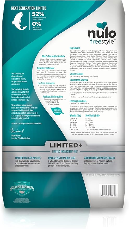 - Limited Ingredient Dog Food – Nulo FreeStyle Limited Salmon Recipe is a grain-free, single-protein dog food designed for dogs with food sensitivities. Crafted with real salmon and no chicken, eggs, or artificial additives.
