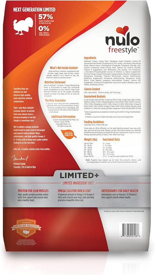 - Limited Ingredient Dog Food – Nulo FreeStyle Limited+ Turkey Recipe is a grain-free, single-protein dog food designed for dogs with food sensitivities. Crafted with real turkey and no chicken, eggs, or artificial additives.