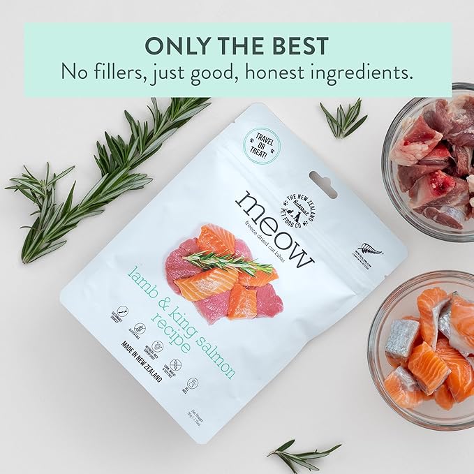 Meow Lamb & King Salmon Freeze Dried Raw Cat Food, Mixer, or Topper, or Treat - High Protein, Natural, Limited Ingredient Recipe 1.76 oz