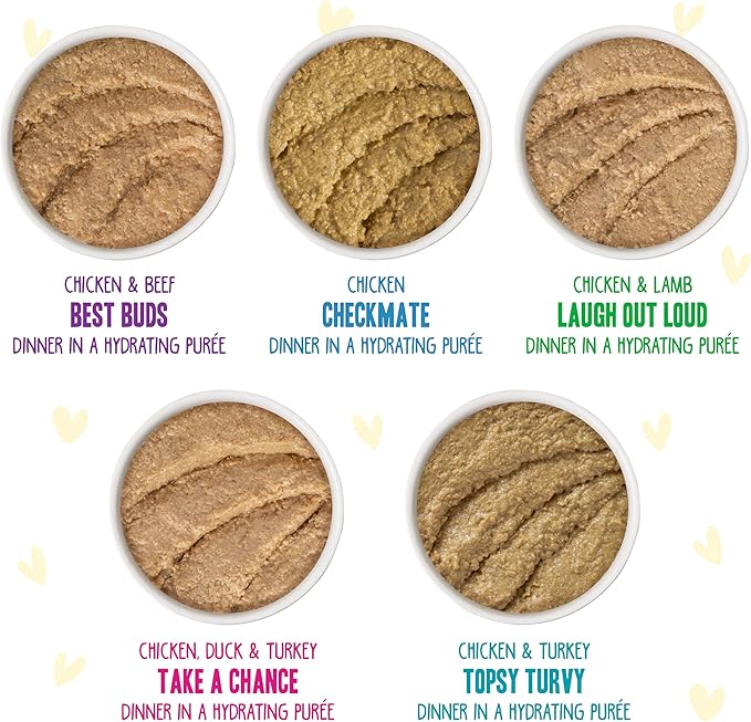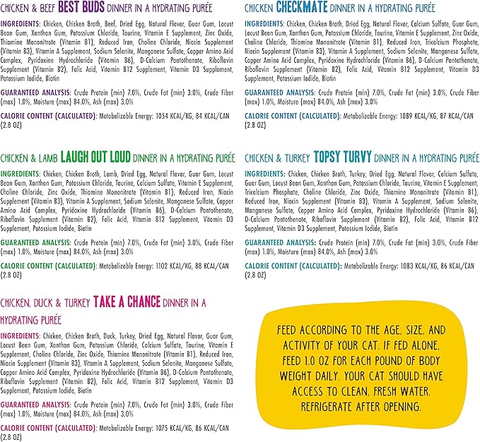 - Perfect for Poultry loving Cats! Variety Pack includes: Chicken Checkmate,Chicken & Beef Best Buds, Chicken & Turkey Topsy Turvy, Chicken & Lamb Laugh Out Loud, Chicken, Duck & Turkey Take a Chance