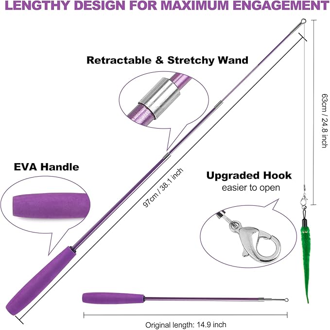 - 【Cat Toys for Indoor Cats】: The cat fishing pole toy is an interactive cat toys for indoor cats. Retractable cat wand combine various worms with bell, attract your cats chasing and jumping, bring them hours of fun. It’s a great way for cat to exercise in play and keep agility and healthy and interact with your pets.