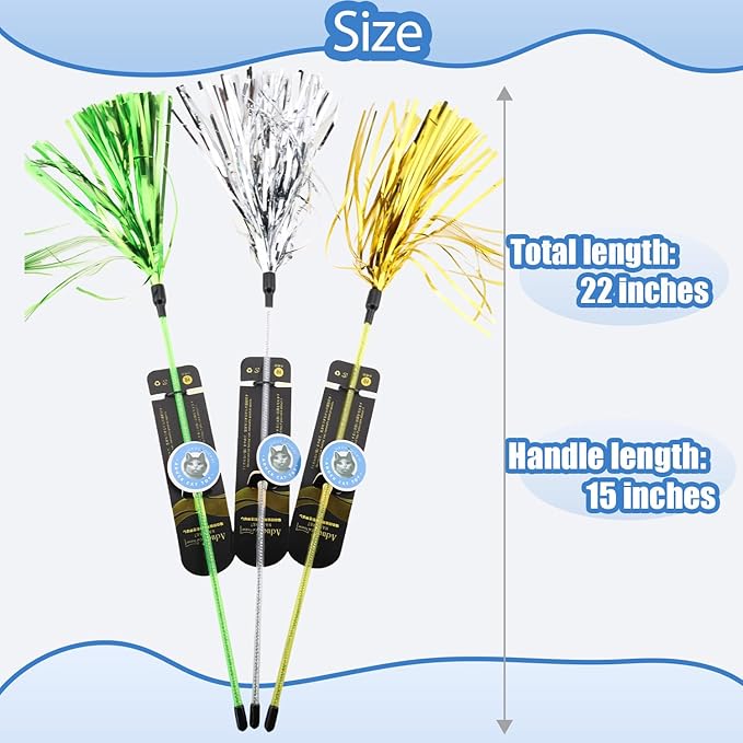 - 😺【Interactive Cat Toys:】:Pack of 3 (Gold + Green + Silver). Colorful tassels and durable wand. This cat wand help your cats keep active and do more exercise, increasing kitten’s interest and stimulate cat’s sense, and make teasing a cat is no longer a manual job for you. This interactive toys engage your cats with you and it builds trust and companionship.