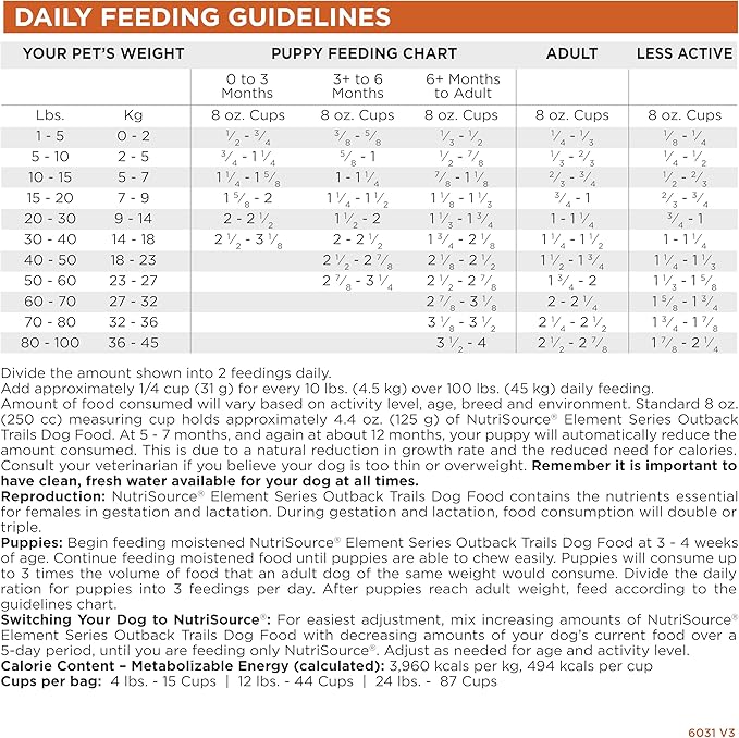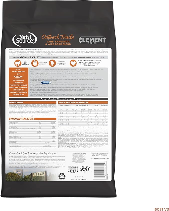 - CONTAINS: (1) 12LB Bag of NutriSource Element Series Outback Trails Dry Dog Food