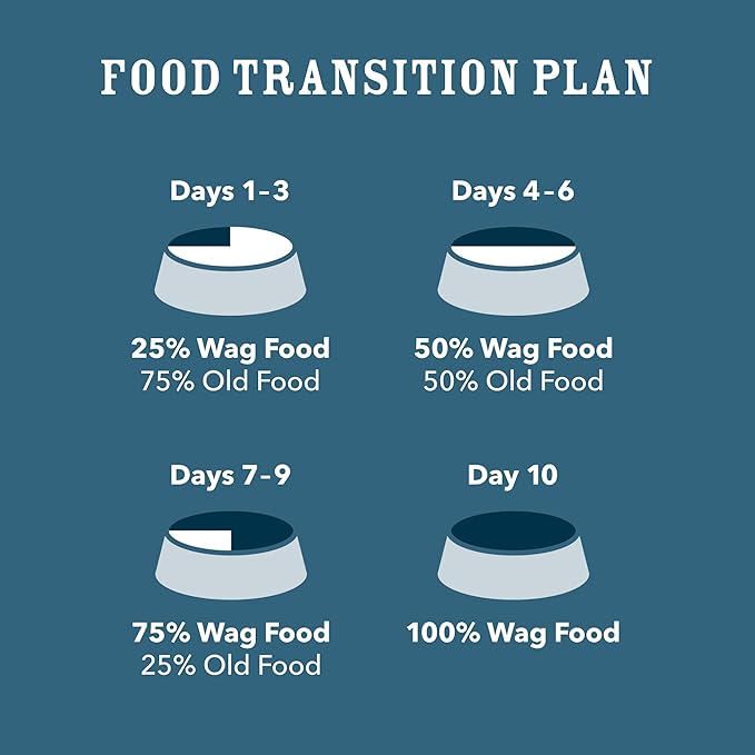 - Gradual transitioning is important to help avoid dietary upsets. Please allow 7–10 days (10–14 days for sensitive dogs) to ease the transition from your dog's current food. Each day, simply feed a little less of the previous food and a little more Wag food.