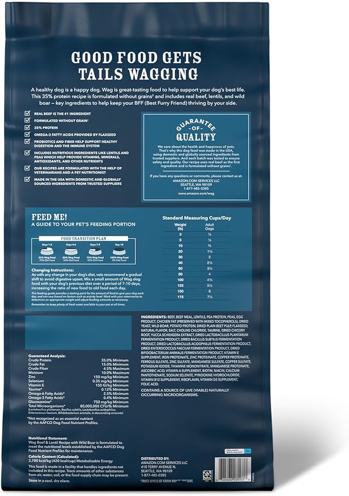 - 24 LB bag of Wag Dry Dog Food, Beef & Lentil Recipe with Wild Boar