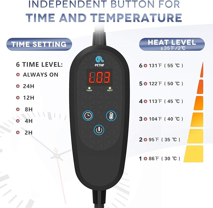 - 【Pet Heating Pad with Timer】: PETNF timer heating pad - Auto shut down when you wanted. timing system has 6 levels: Always(Default Setting, don't need to press any button) and 2/4/8/12/24 H(Need press the Timer button). The pad will stop heating when the timer out. and the indicator light moves down automatically when every 4H passed to tell you how much time left.