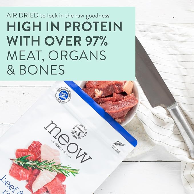 The New Zealand Natural Pet Food Co. Meow Air Dried Cat Food - Beef & Hoki Recipe - Topper, Mixer or as Cat Training Treats, All Life Stages - 26.5 oz
