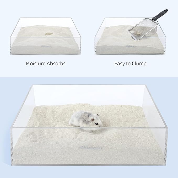 - [ Easy Replacement & Say Goodbye To Swallowing ] Natural zeolite and pumice are ground into small and uniform particles, making the hamster cleaning sand naturally absorbent, and it will clump soon after encountering water, keeping hamsters from swallowing and causing gastrointestinal danger, you can clean with the cleaning shovel and creates a fresh and clean hideout for your pets.