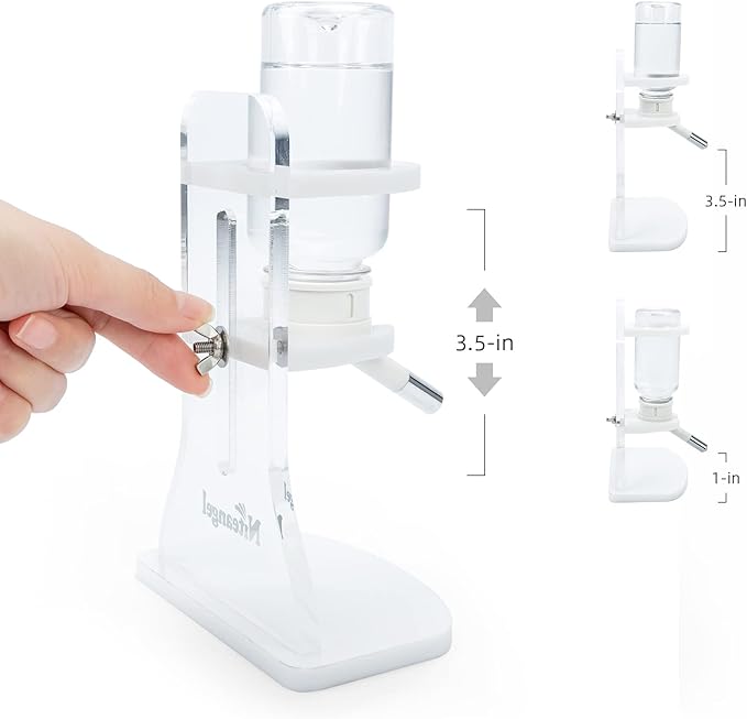 - Adjustable Height & More Comfortable: The base of water bottle holder offers you an opportunity to place your water bottle whereas you wish.It can be lowered or raised to suit a variety of pet sizes and heights. Let the small animal keep a natural posture when drinking water and ensure more comfortable drinking water, what's more, the large capacity of 120ml is enough for a hamster to drink water for a day until you go home.