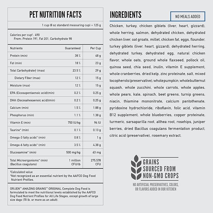- One (1) 22.5lb bag of ORIJEN AMAZING GRAINS Original Dry Dog Food.