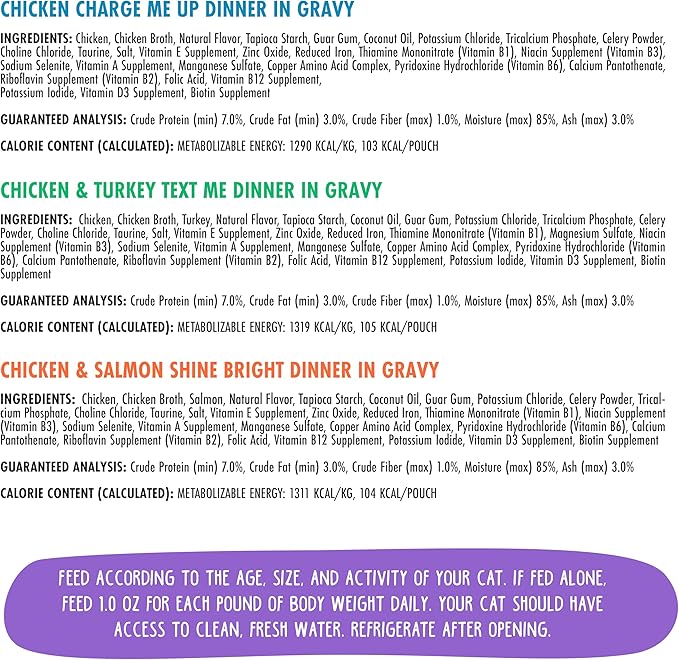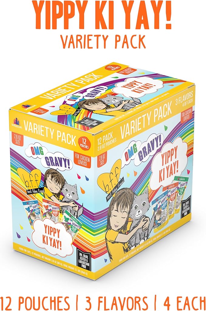 - Yippy Ki Yay Yellows! Variety Pack, 2.8oz Pouch (Pack of 12) A selection of three all natural wet cat food recipes, featuring cage-free chicken in a delicious gravy cats can’t resist!