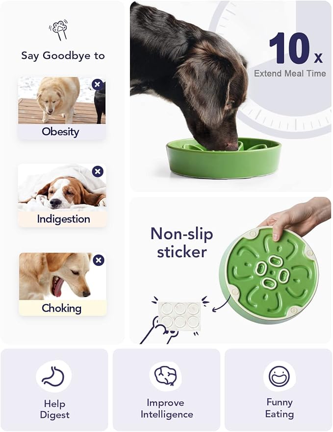 - Slow Down Eating, Bring Dog A Healthy Diet: Fast-eating dogs experience bloat, regurgitation, and obesity easily. Our slow feeder dog bowl design with the ridges and maze pattern helps your dog to eat slower than 49 times. Your dog could change his overeating behavior through a challenge and fun mealtime