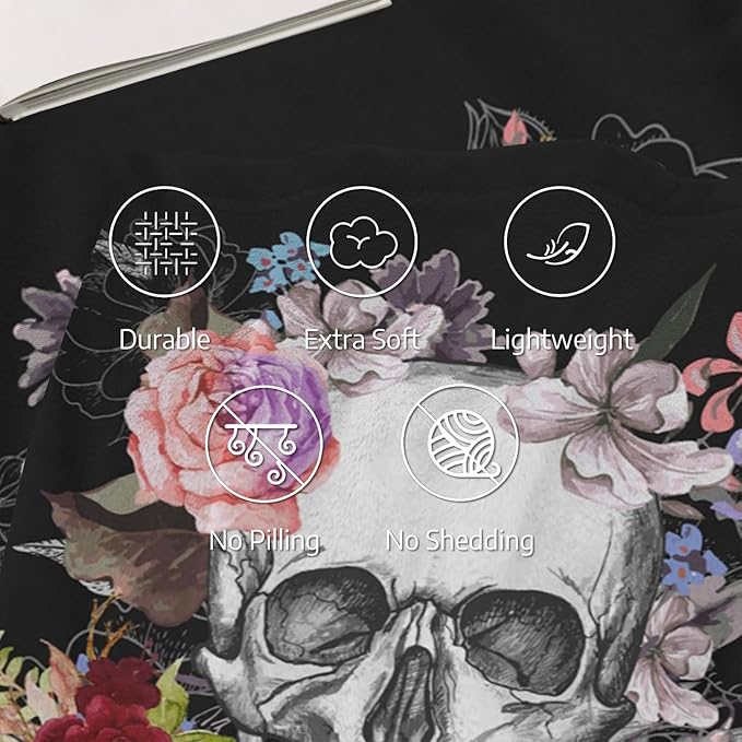 Skull and Flowers Day of The Dead Throw Blankets Lightweight Plush Fuzzy Cozy Soft Bedding, Fleece Throw Blankets All Season for Sofa Couch Bed 50x60 inches