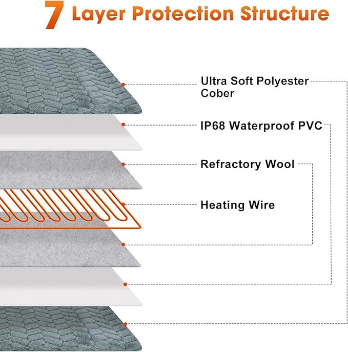 - ๐ถใ7 layer Protective StructureใThe pet heating pad is made of soft velvet cover, waterproof PVC enclose, refractory wool and heating wire. Flame Retardant & Waterproof PVC heating pad has the highest-grade V-0 flame retardant capability with UL-certified heating wire to protect pets from burns. The cord is made from chew resistant steel and can protect your pet from electric shocks if it tends to chew on cables.