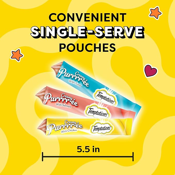 - Cats Lose Their Cool: Temptations Creamy Puree Wet Cat Treats deliver irresistible chicken, salmon, or tuna flavor in a squeezable, creamy puree your cat will come running for