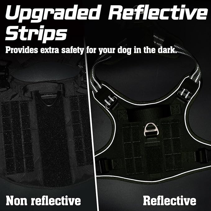 - Ultra Safety Design: The reflective trims all around the tactical dog harness for optimal visibility and security at night. Two secure metal leash attachments for different occasions. Daily back clip for well-trained dog's casual walking or jogging. No-pull front clip helps discourage your dog from pulling