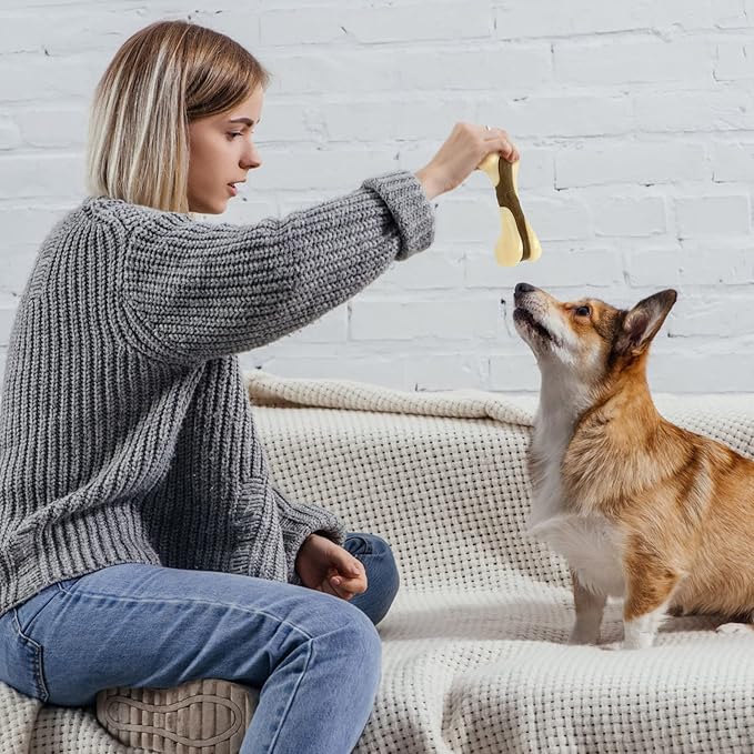 - Bone Shape Design: the realistic bone shape makes your pet easy to recognize, establishes a positive connection with the dog toy, and reduces their anxiety and boredom; Interesting and curved design makes it easy for dogs to hold and chew; These toys are also infused with beef flavoring, you can put pumpkin puree, and mashed potatoes on the toy as well to make them appealing to your dog