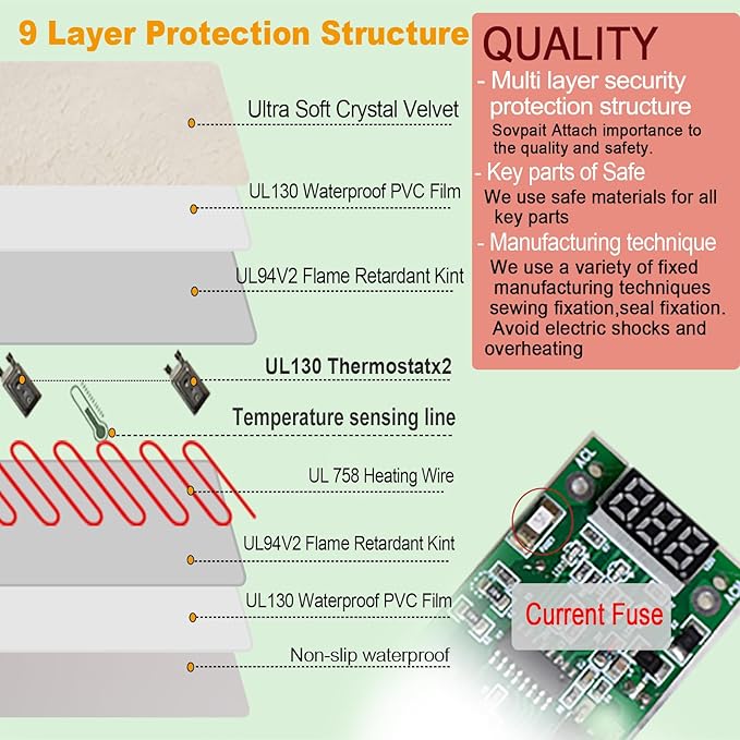 - SAFETY: Multi layer security protection structure with safety heating wire Soft PVC envelope with waterproof and flame-retardant function. Built-in intelligent temperature sensor in the heating pad and safety temperature protector BRAND YOU TRUST: Designed & by SOVPAIT with OVER 18 years of experience in creating safe, innovative, quality products for pets We are believe that your pets will love the pet heating pad.