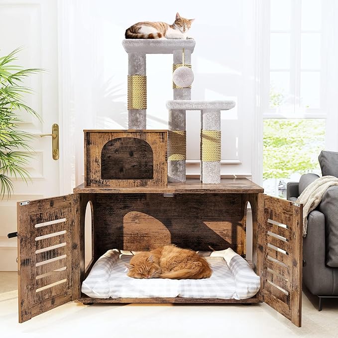 Cat Litter Box Enclosure with Cat Tree Tower 2-in-1 Hidden Pet Washroom Furniture with Scratching Post and Soft Plush Perch Platform Wooden Cat House Divided Condo for Indoor Large Cats Rustic Brown