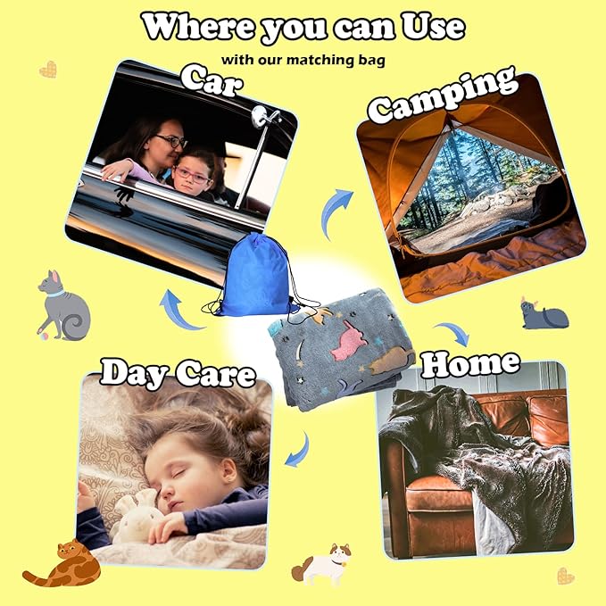 - Quality and the voice of our customers are our primary pursuit. This super soft cat kittey glow in the dark blanket is made of flannel material, which provides warmth while maintaining a soft touch, playing a role in comforting. This new kids girl blanket set also comes with a simple backpack, so you can not only put away the blanket anytime, anywhere, but also take it wherever you want.