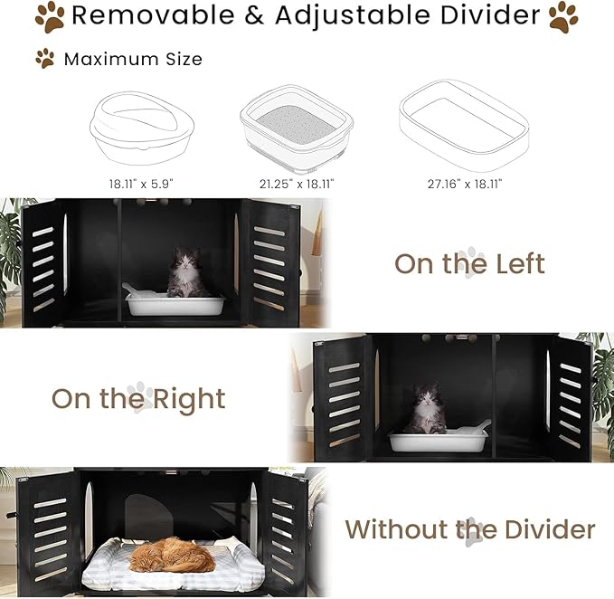 - Easy Cleaning & Reduced Litter Odor: This stylish cat furniture provides a private, clean, and comfortable place for your cat. A large hidden litter box on one side with a divider in the middle to prevent litter from being scattered around and help remove residual odors and prevent litter from spreading. The double-door design and latching design make daily cleaning and cat care easy and hassle-free.