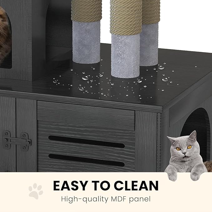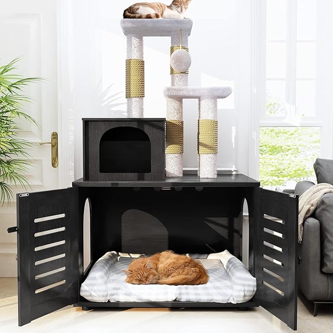 Cat Litter Box Enclosure with Cat Tree Tower 2-in-1 Hidden Pet Washroom Furniture with Scratching Post and Soft Plush Perch Platform Wooden Cat House Divided Condo for Indoor Large Cats Black