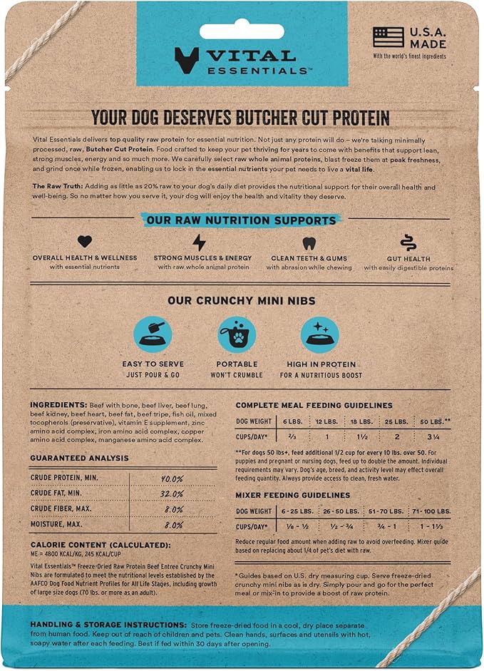 - CRUNCHY FREEZE-DRIED RAW BEEF DOG FOOD: Vital Essentials Crunchy Freeze Dried Dog Food packs more protein than industry standard into every bite to deliver the peak vitality your dog deserves, especially when compared to dehydrated dog food. This complete and balanced freeze-dried raw dog food is made with premium butcher cut beef, responsibly sourced in the USA.