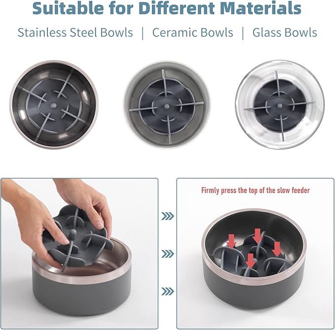 - Turn Your Dog Bowl Into A Slow Feeder: Suitable for dog bowls of various materials, just simply press the slow feeder insert down on the bottom of it. Helps to slow dog eating down, reduce hiccups, vomiting or tummy aches
