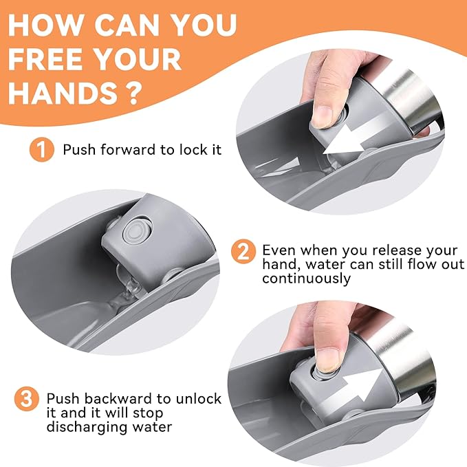 - Easy to Use & Recyclable Water: Quickly turn over the leaf-shaped dog water bowl, then press the button to allow water flow and quench your doggie's thirst. Press the button and push it forward to lock it, and the water will flow out continuously. After drinking, press the button and tilt back, excess water will flow back into the bottle. This helps reduce water waste.