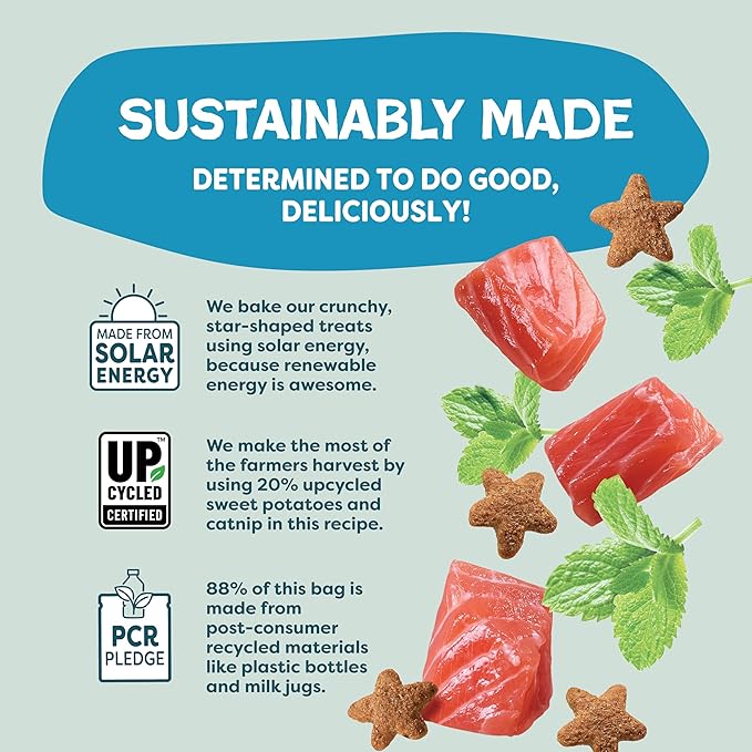 - Cat Treats for Skin & Coat Support: Your cat's skin & coat routine just upped its game. With a few of these delicious crunchy, star-shaped bites, they'll be doing the cat walk with perfection, from head to toe. Made with upcycled sweet potatoes and superfood ingredients, such as fresh tuna and catnip. Includes one 2.5 oz bag.