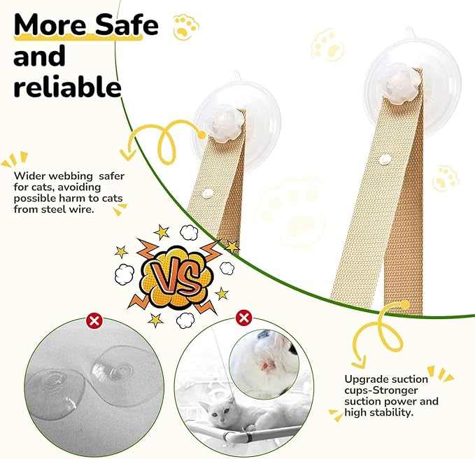 - Strong and Sturdy Suction Cups - Cat window perch can hold large cats up to 40lbs. Complete installation accessories. The cat window perch adopts a smooth solid wood frame and thick Oxford seat, and enhanced with 4 strong suction cups to stick, and 2 sturdy ropes, so the cat window perch is very stable. Cat window beds can be stably installed on the window, cat window hammocks can withstand the jumping and any activities of your cats