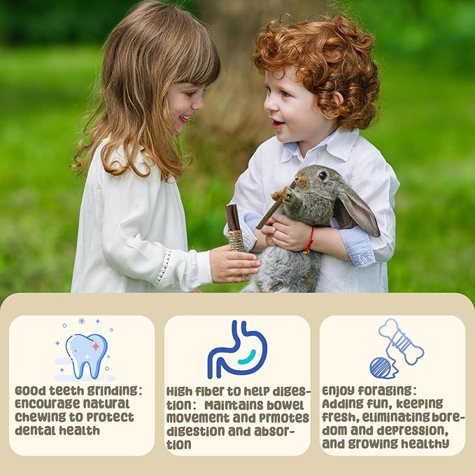 - NATURAL CHINCHILLA TOYS: Rabbit chew toys are handmade from natural materials, no additives, no added coloring. With a good teething effect, high fiber to help digestion, your pet can safely chew and enjoy foraging, happy all day.