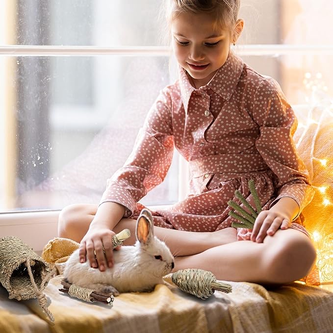 - RABBIT ENRICHMENT CHEW TOYS: We offer quality and fun bunny toys containing 1 seaweed hanging basket, 1 natural woven carrot, 1 aquatic plant apple stick, 1 aquatic plant sweet bamboo, 5 timothy hay stick, Look! Your little friend is busy with the rabbit toys.