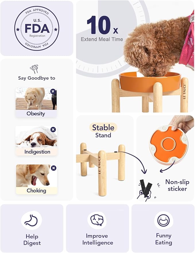 LE TAUCI Ceramic Slow Feed Dog Bowls, Elevated, Anti-Gulping, Non-Slip, 6 inch, Orange