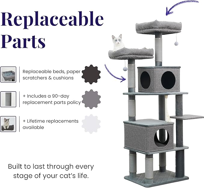 Catry Stella 7-Level 67.5” Linen & Quilted Velvet Cat Tree with Recycled Paper Scratchers, Two Condos, Removable Beds, Toys, Easy to Clean, Ideal for Large Cats and Multi-Cat Homes (Zinc Gray)