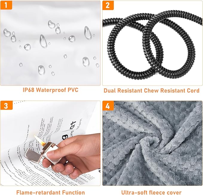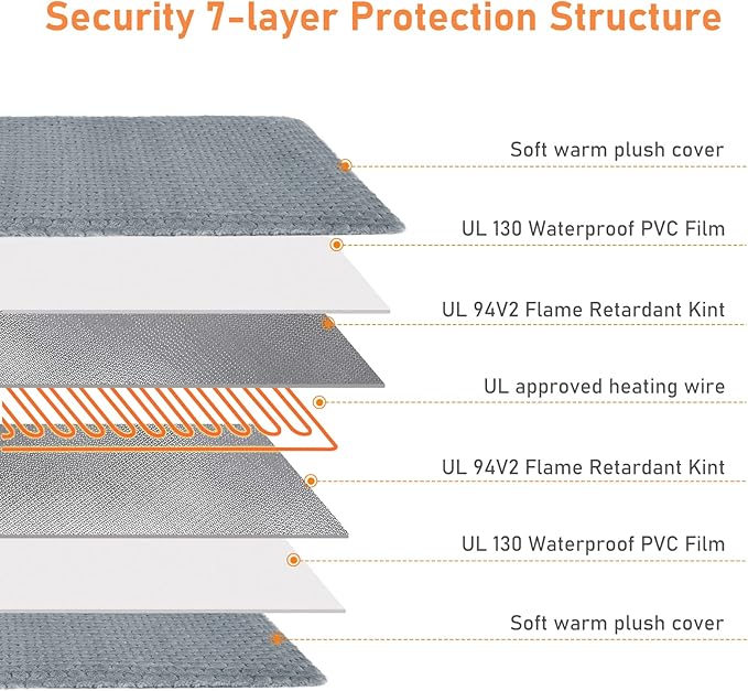 - ๐ถUnique Safety Design: In order to prevent dogs from biting the wire and getting electrocuted, the wire is wrapped by spiral chewy cover. 7-layer protective structure with UL-certified heating wire protect pets from burns. Soft PVC envelope with waterproof and flame-retardant function. Built-in intelligent temperature sensor in the heating pad to prevent overheating to protect pets. Donโt let your pets lay on the pet heating pad without a plush cover.